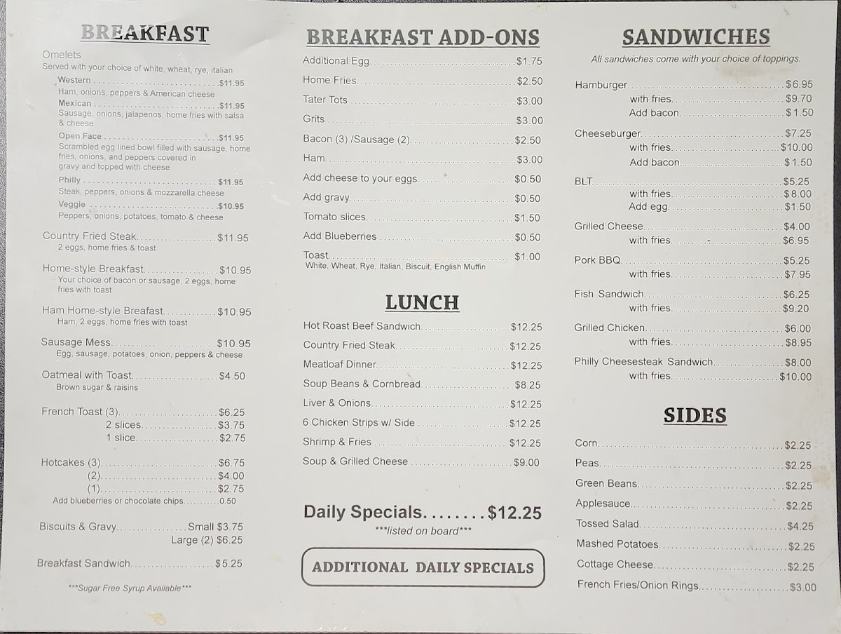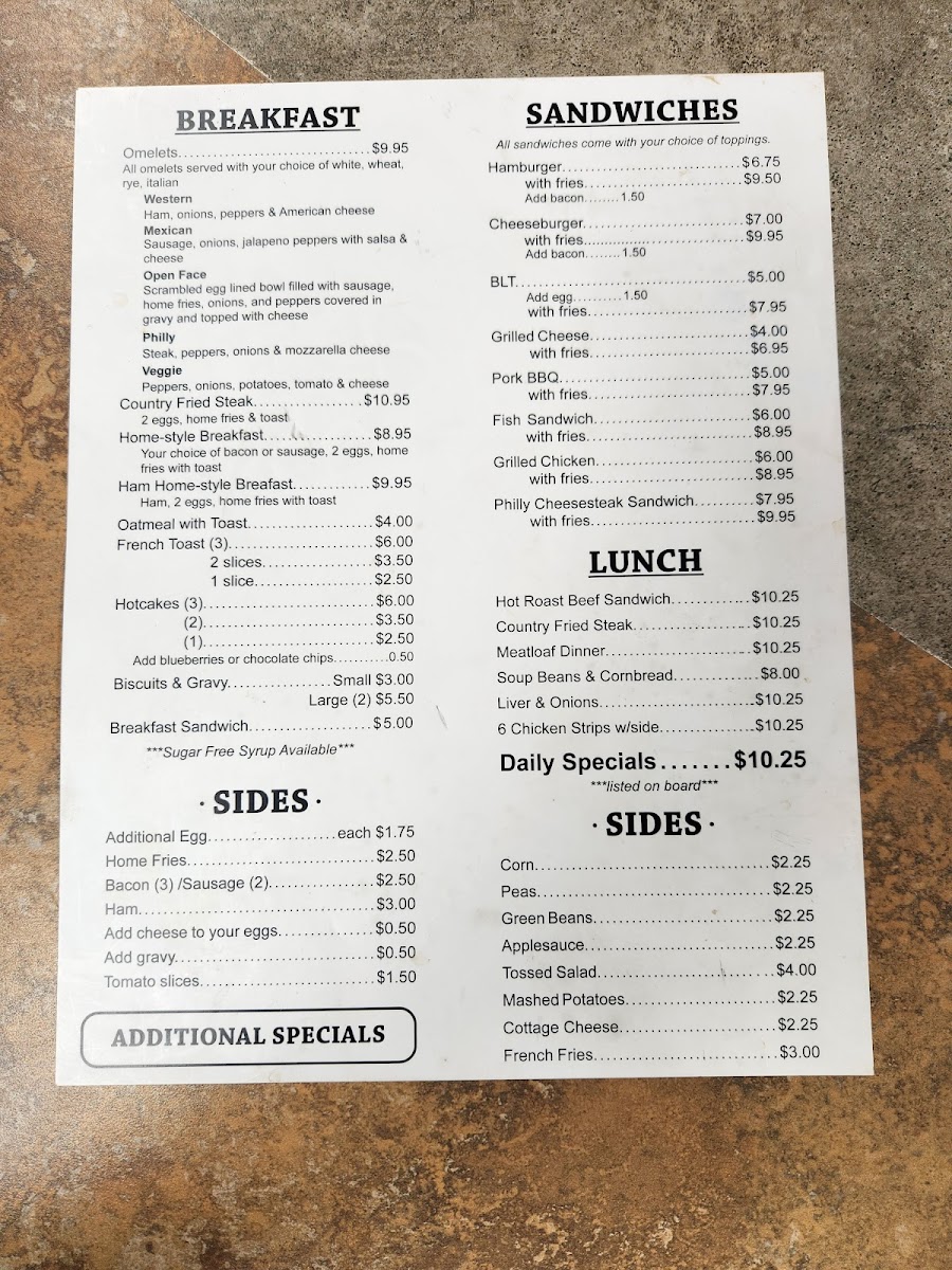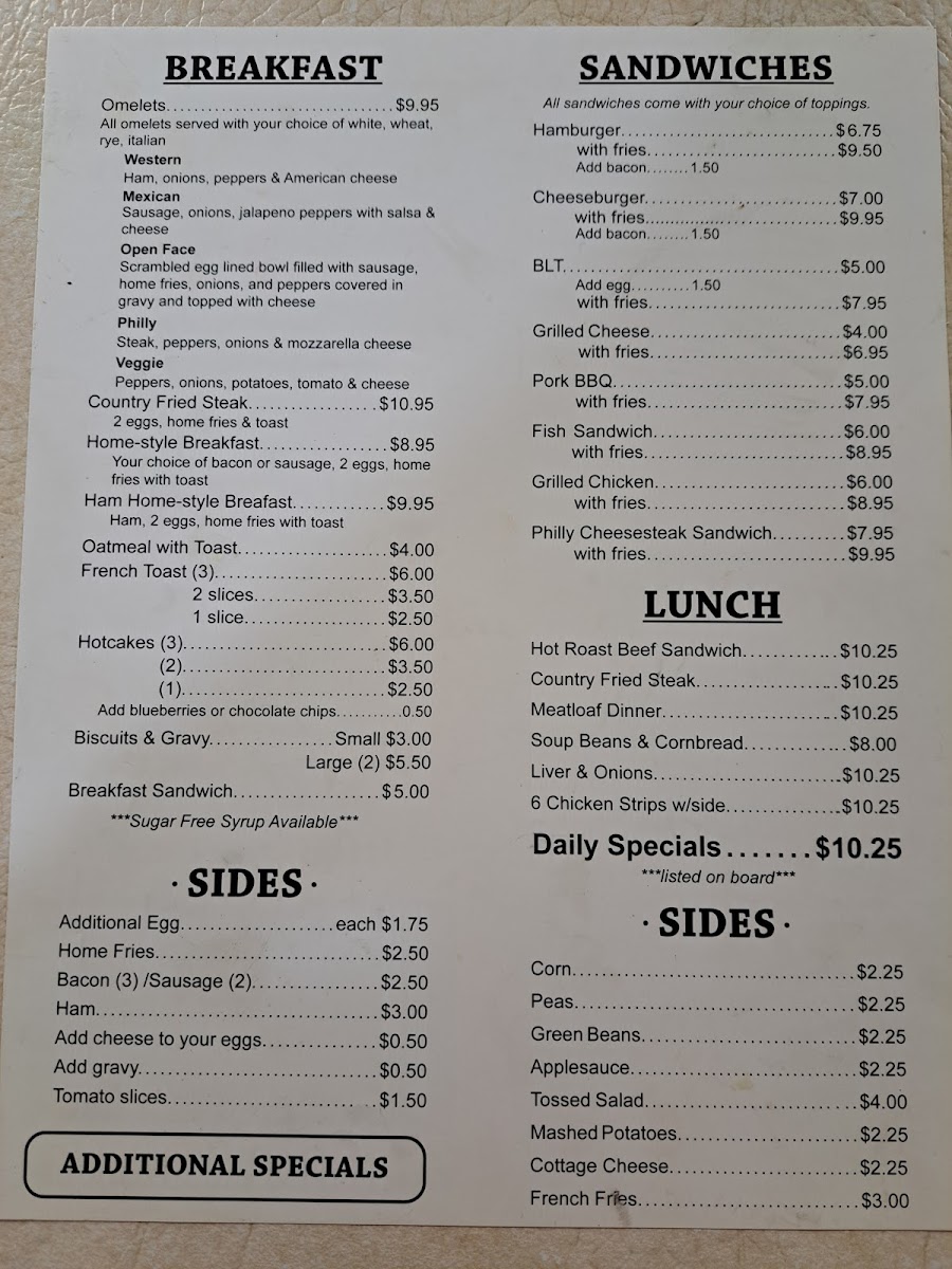 Your choice of bacon or sausage, 2 eggs, home fries with toast.