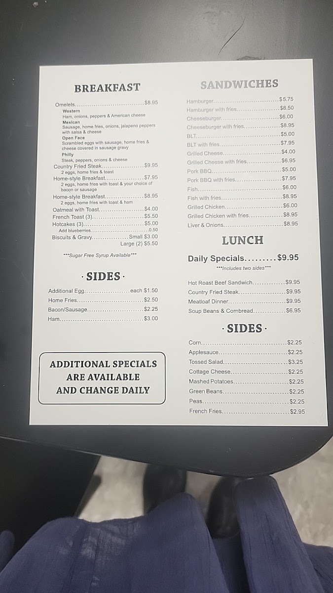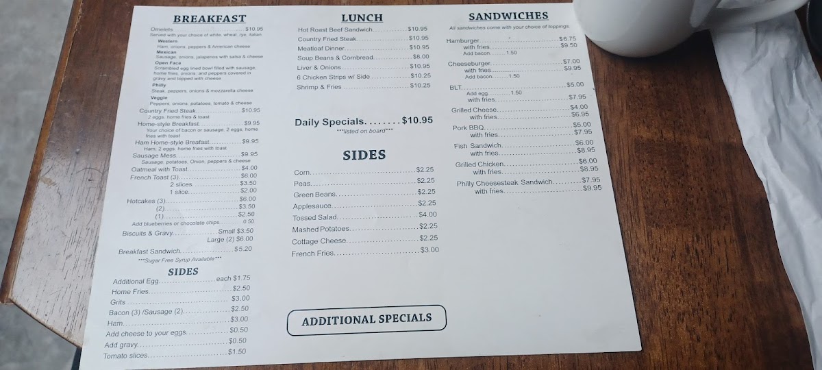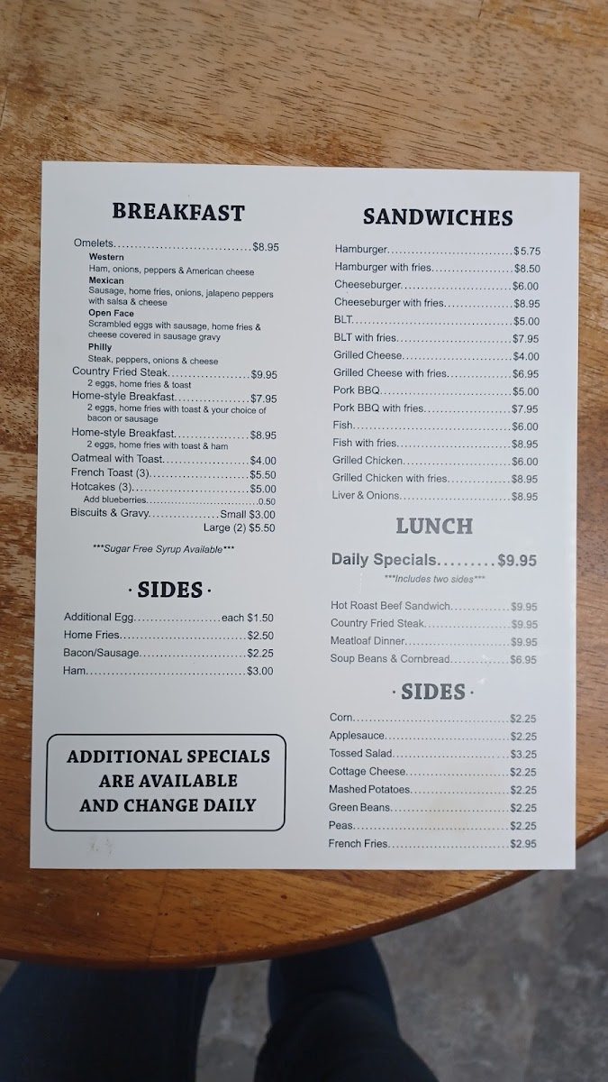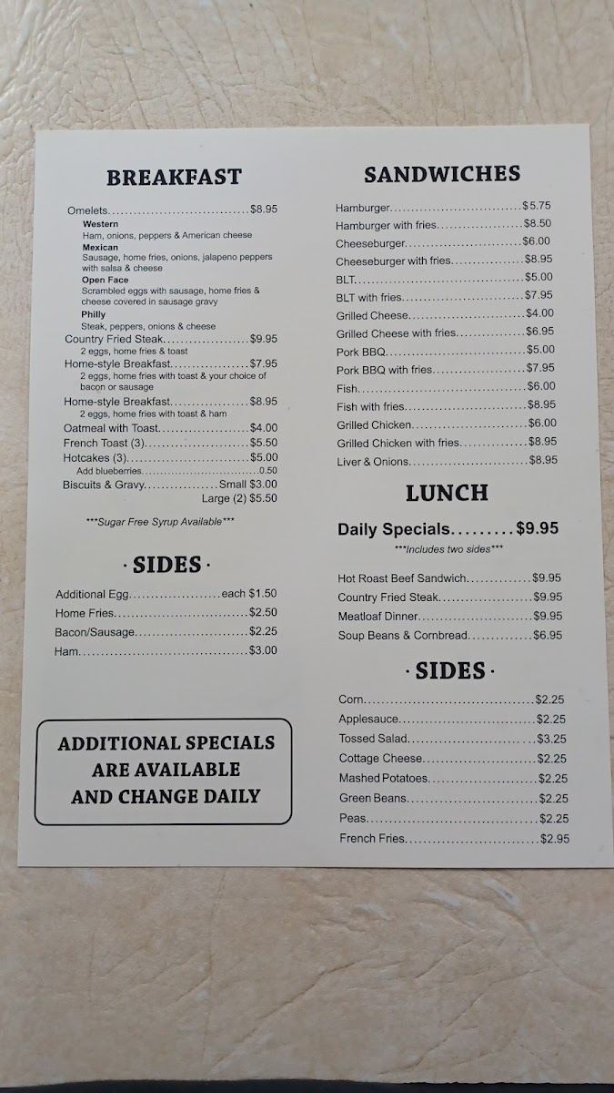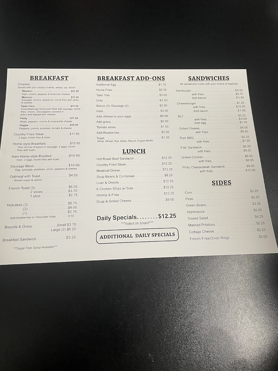Your choice of bacon or sausage, 2 eggs, home fries with toast.